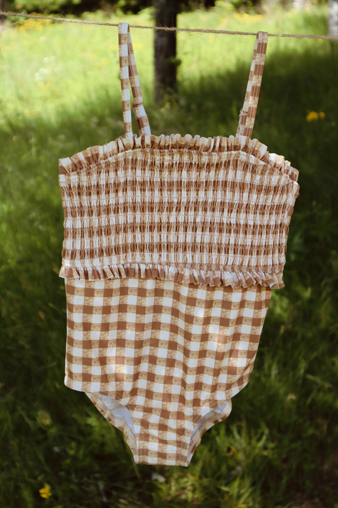 Rutig baddräkt med volang och resår upptill. Justerbara axelband.